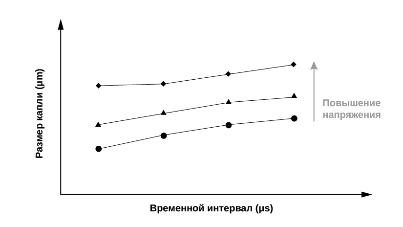 Формы волн полагаются на напряжение для доставки энергии привода (≈ напряжение²×время/сопротивление). Недостаточное напряжение приводит к появлению капель малого размера или засорениям; избыточное напряжение грозит перегревом, повреждением головки или неаккуратным разлетом капель.